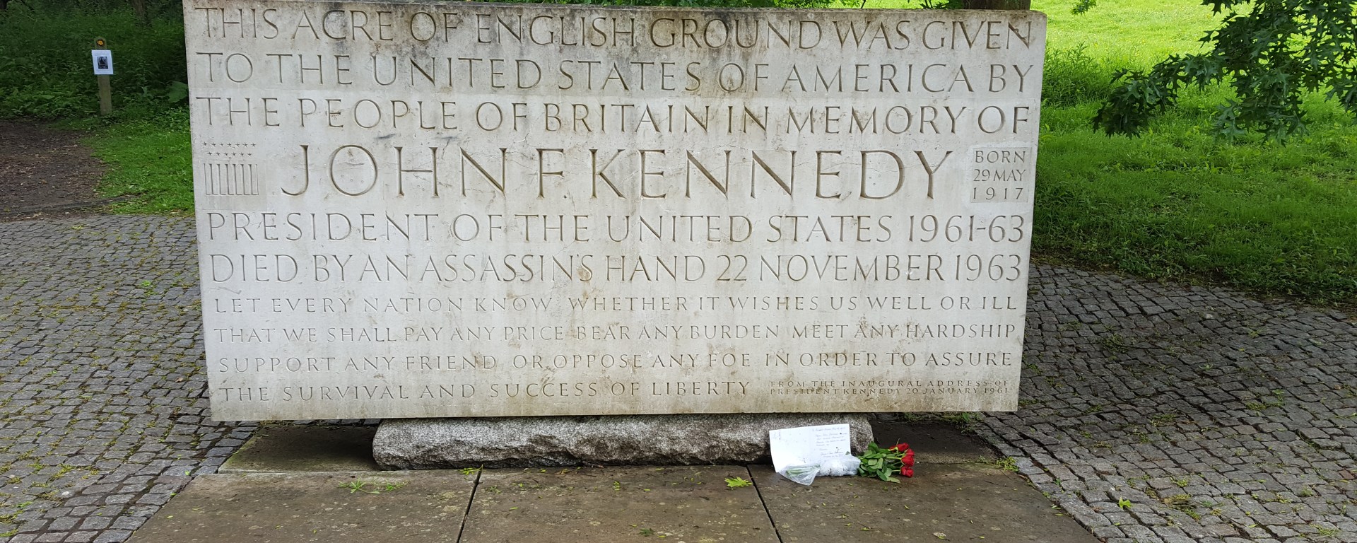 In nearby woods, at the top of a hewn stone staircase, sits a memorial to JFK, within an area of land which the UK Government gifted to the US from the Crown Estate, shortly after Kennedy’s assassination in November 1963. The memorial quotes his promise to “pay any price, bear any burden… to assure the survival and success of liberty.”