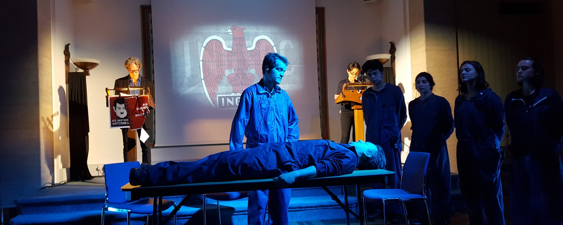 Today’s performance – on the anniversary of the D-Day landings, a significant day for freedom if ever there was one, and in the week of a General Election – was part of the UCL Festival of Culture. A company of players recreated the scenes from the book as various actors, politicians and others read from it. The performance started at 9am and concluded at 10pm; the extracts I saw involved readings by Alan Johnson, perhaps Labour’s best leader who never was of recent years, and actors Harriet Walter and Guy Paul. The production excelled in bringing out the power of Orwell’s words: